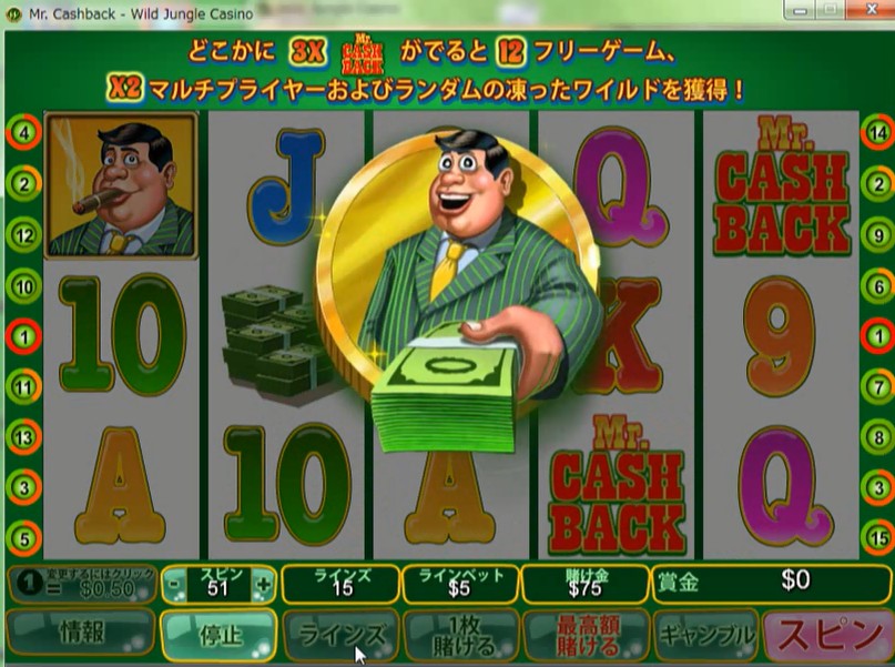 ボーナスゲームはそのゲームによっていろいろな形があります。ここではそのボーナスゲームの例をいくつかあげます。例1 ビデオスロット ミスターキャッシュバックこのス...